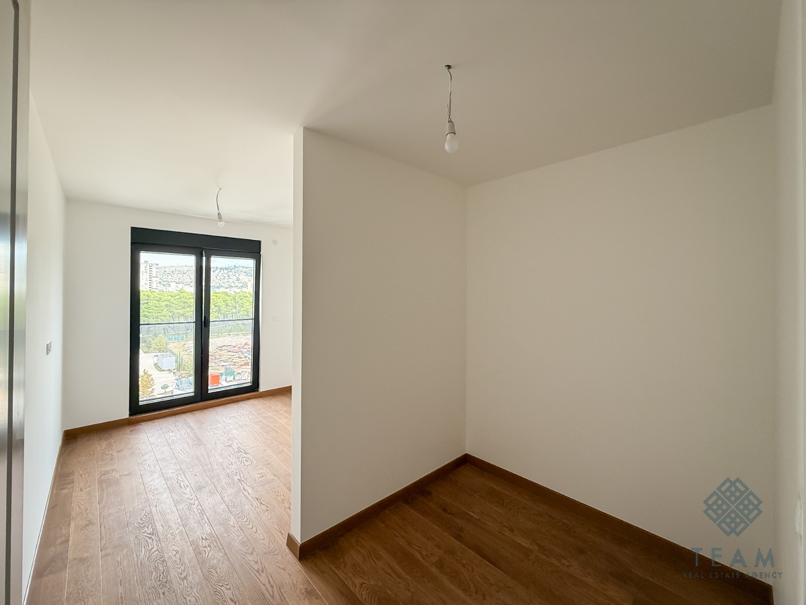 U stanu se nalaze se tri spavaće sobe — glavna (master) soba posjeduje sopstveno kupatilo, a dvije spavaće sobe imaju pregradne zone predviđene za walk-in plakare, što doprinosi praktičnosti i eleganciji prostora.