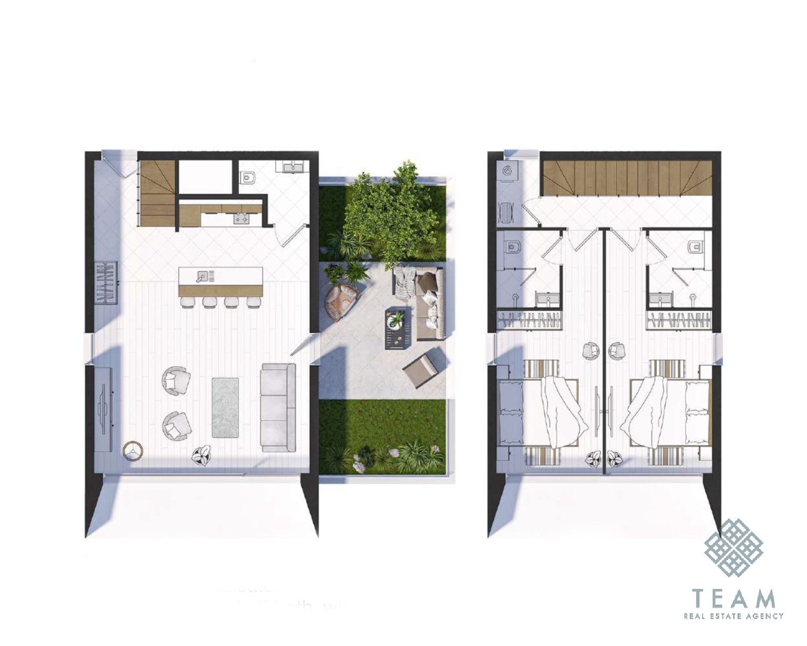 Elegantan dvosoban dupleks stan ukupne površine 129,6 m², sa privatnom terasom i pripadajućom ostavom. Donji nivo obuhvata svijetao dnevni boravak sa toaletom, dok se na gornjem nivou nalaze dvije komforne spavaće sobe, svaka sa sopstvenim kupatilom.