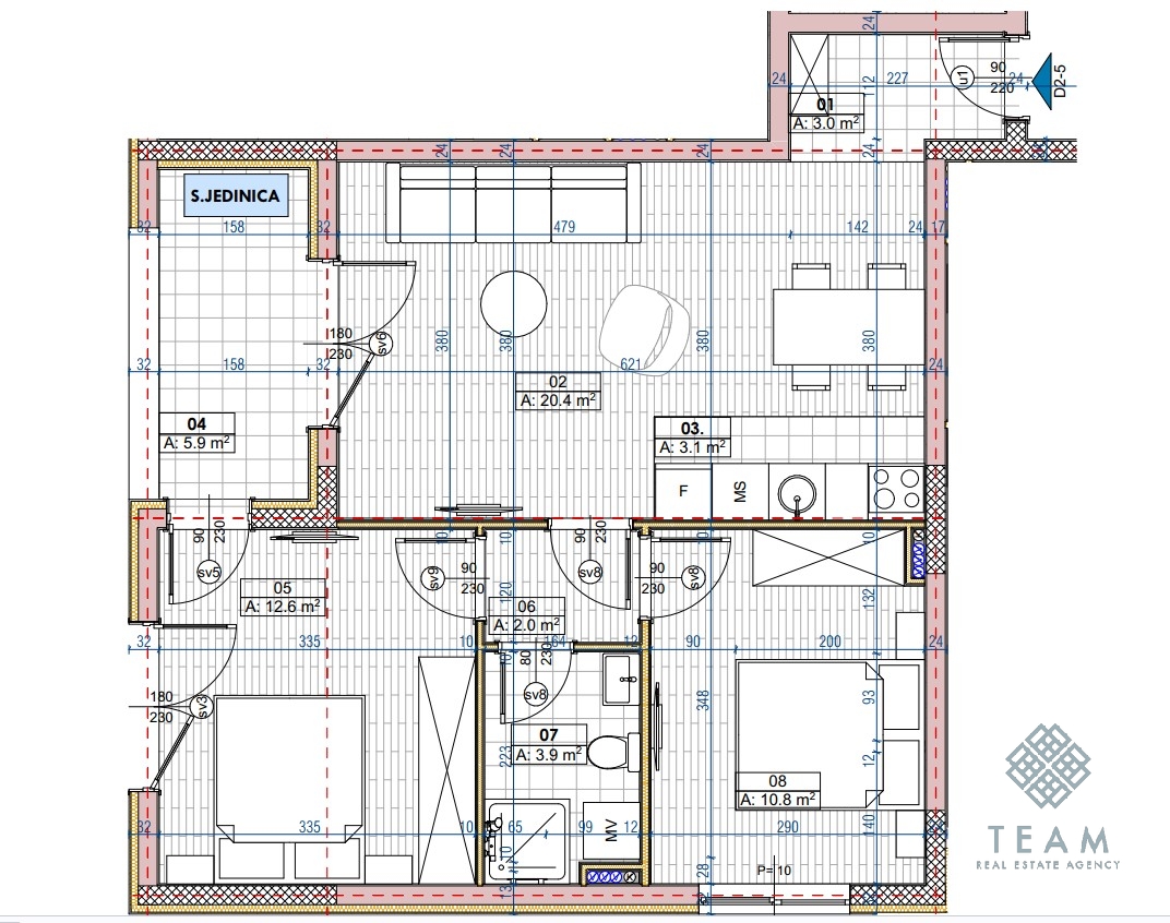 Struktura stana obuhvata: ulazni hodnik, dnevni boravak sa trpezarijom i kuhinjom, 2 spavaće sobe, kupatilo i terasa.