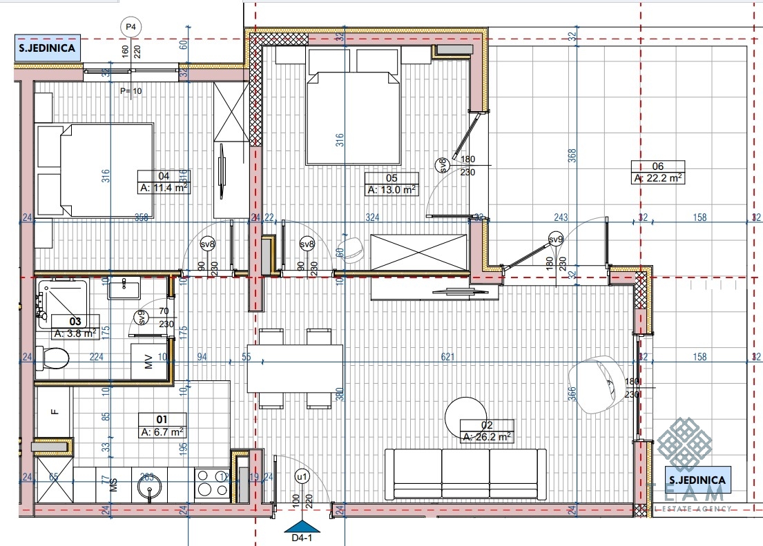 Struktura stana obuhvata: dnevni boravak sa trpezarijom i kuhinjom, 2 spavaće sobe, kupatilo i terasu.