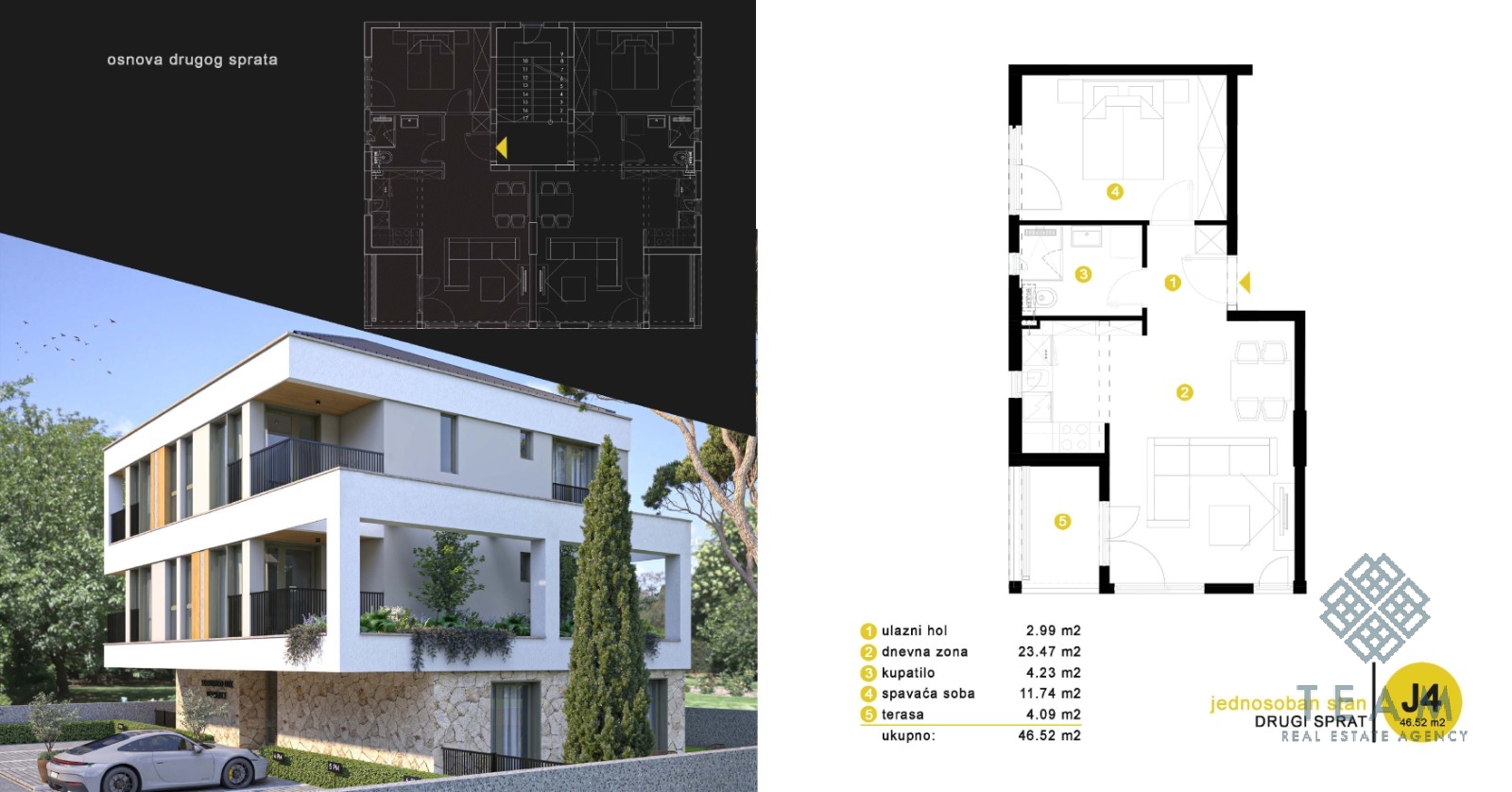 Na prodaju je jednosoban stan površine 47 m², smješten na drugom spratu objekta u izgradnji u Dalmatinskoj ulici, kod hotela Perla.