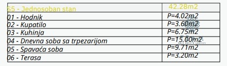 Struktura stana: hodnik, dnevni boravak sa trpezarijom, kuhinja, spavaća soba, kupatilo i terasa.