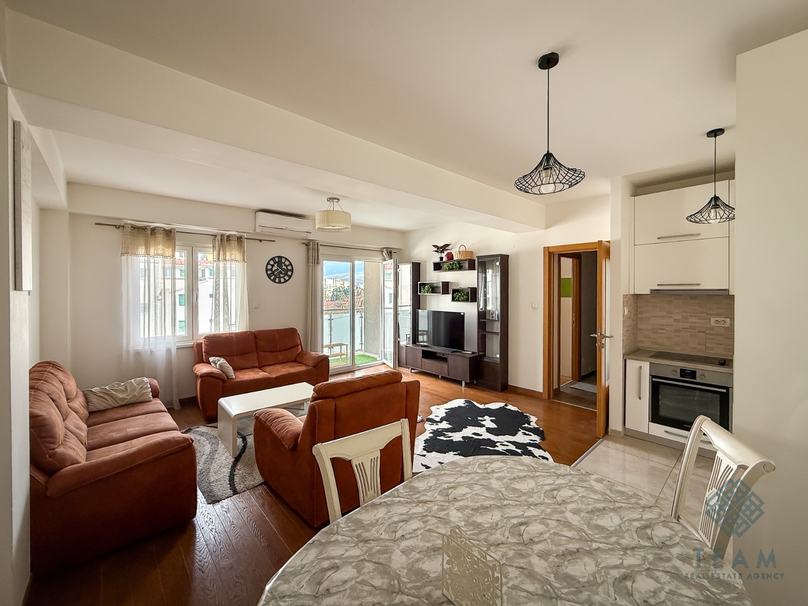Stan je kompletno namješten. Strukturu čine dnevna soba sa kuhinjom i trpezarijom u open-space konceptu, dvije spavaće sobe i dva kupatila.
