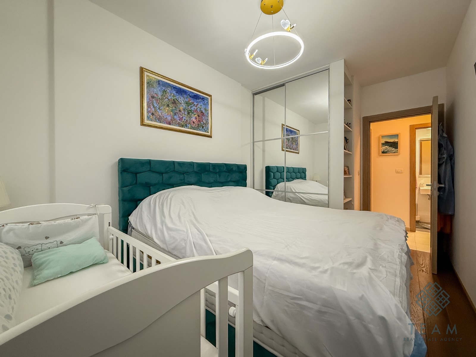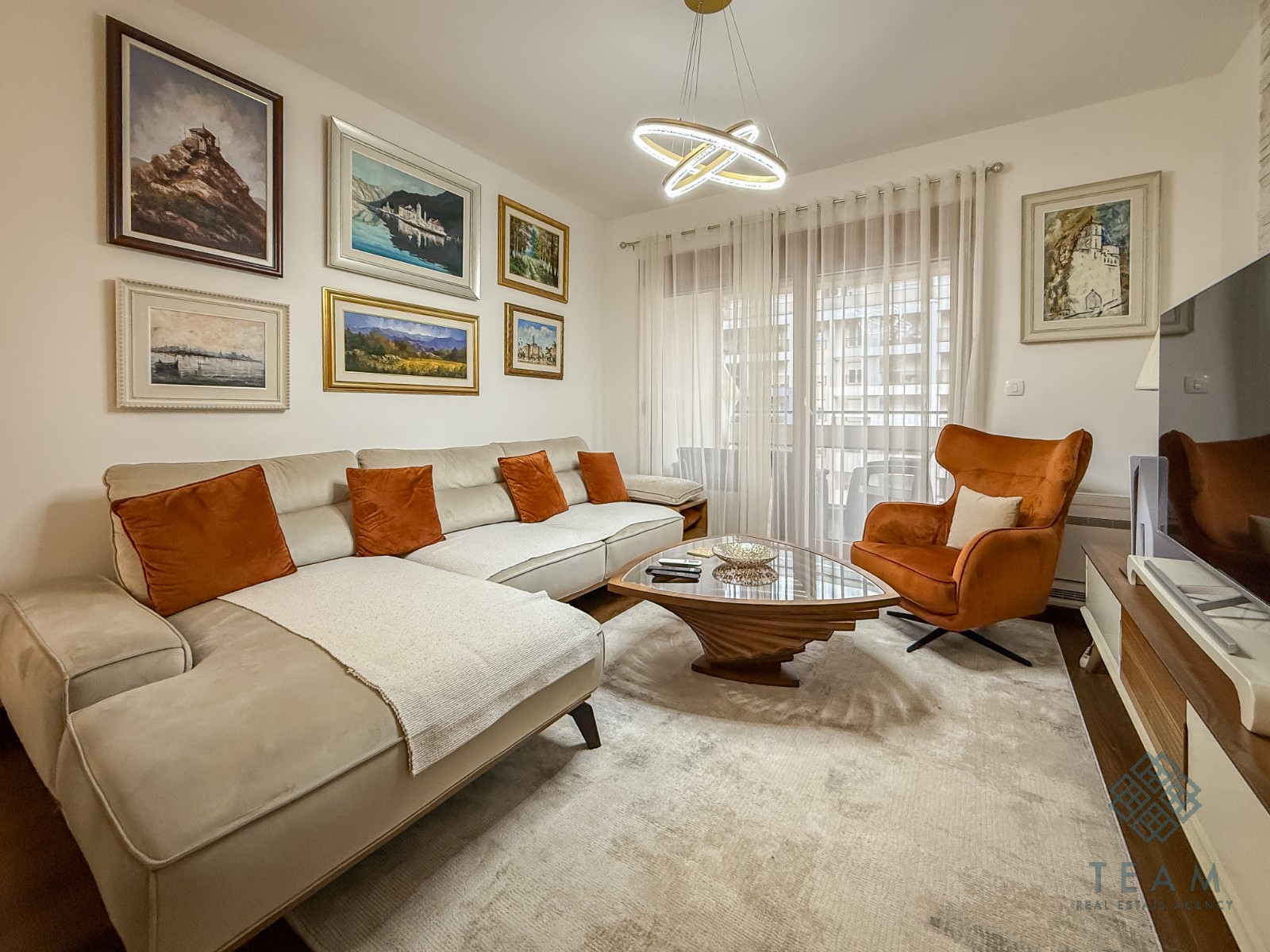 Stan se nalazi u luksuznijoj zgradi na jednoj od najtraženijih lokacija u gradu. Odlikuje ga moderan enterijer, kvalitetan namještaj i ugradna tehnika. Raspored je funkcionalan i komforan, sa dvije spavaće sobe i dobro osmišljenim prostorom.