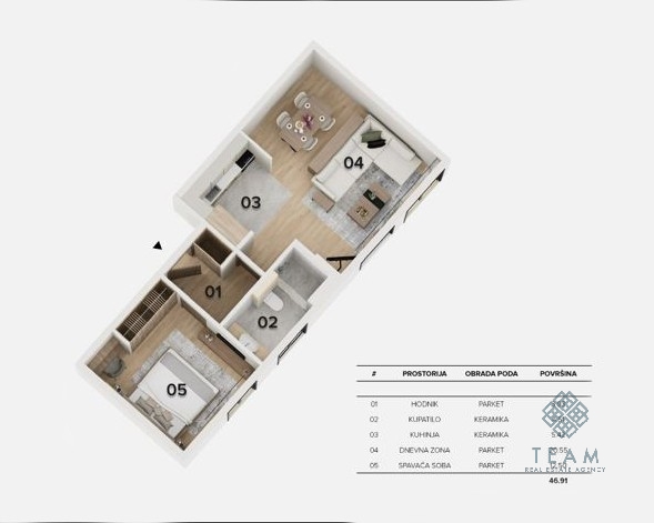 Kvadratura: 47㎡ Broj spavaćih soba: 1 Broj kupatila: 1 Sprat 2