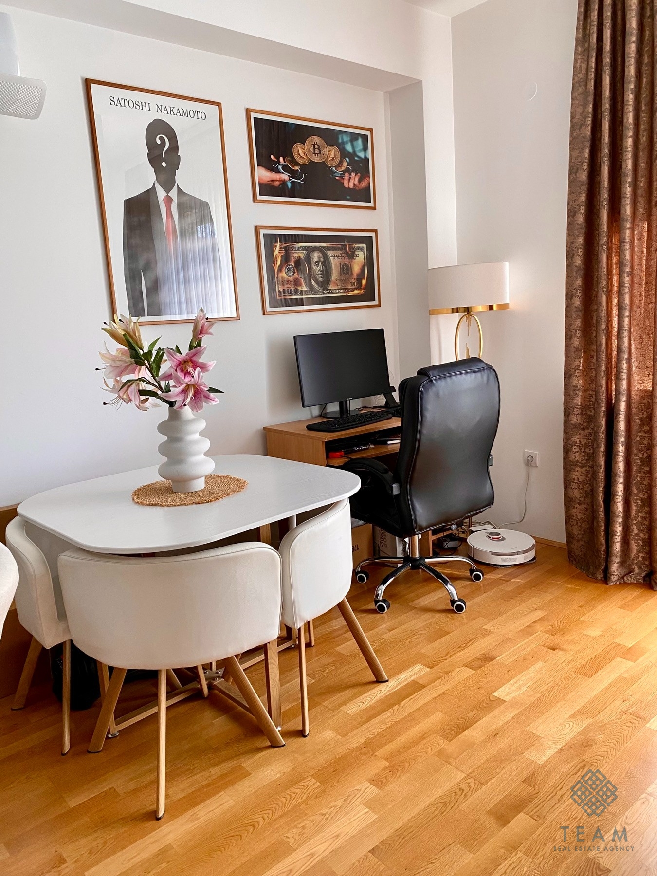 Кухня полностью оборудована встроенной бытовой техникой: холодильник с морозильной камерой, посудомоечная машина, духовой шкаф, варочная панель и вытяжка. В гостиной — раскладной диван. Все коммунальные счета оплачиваются вовремя; текущие владельцы получают скидку 38% на активную электроэнергию, а средние расходы на электричество составляют всего 20–30 евро в месяц. Благодаря удачному расположению квартиры, систему отопления и охлаждения не нужно использовать круглосуточно ни летом, ни зимой.