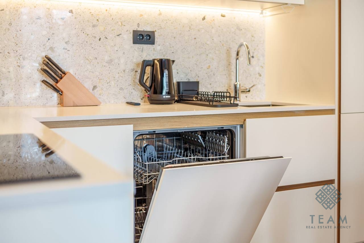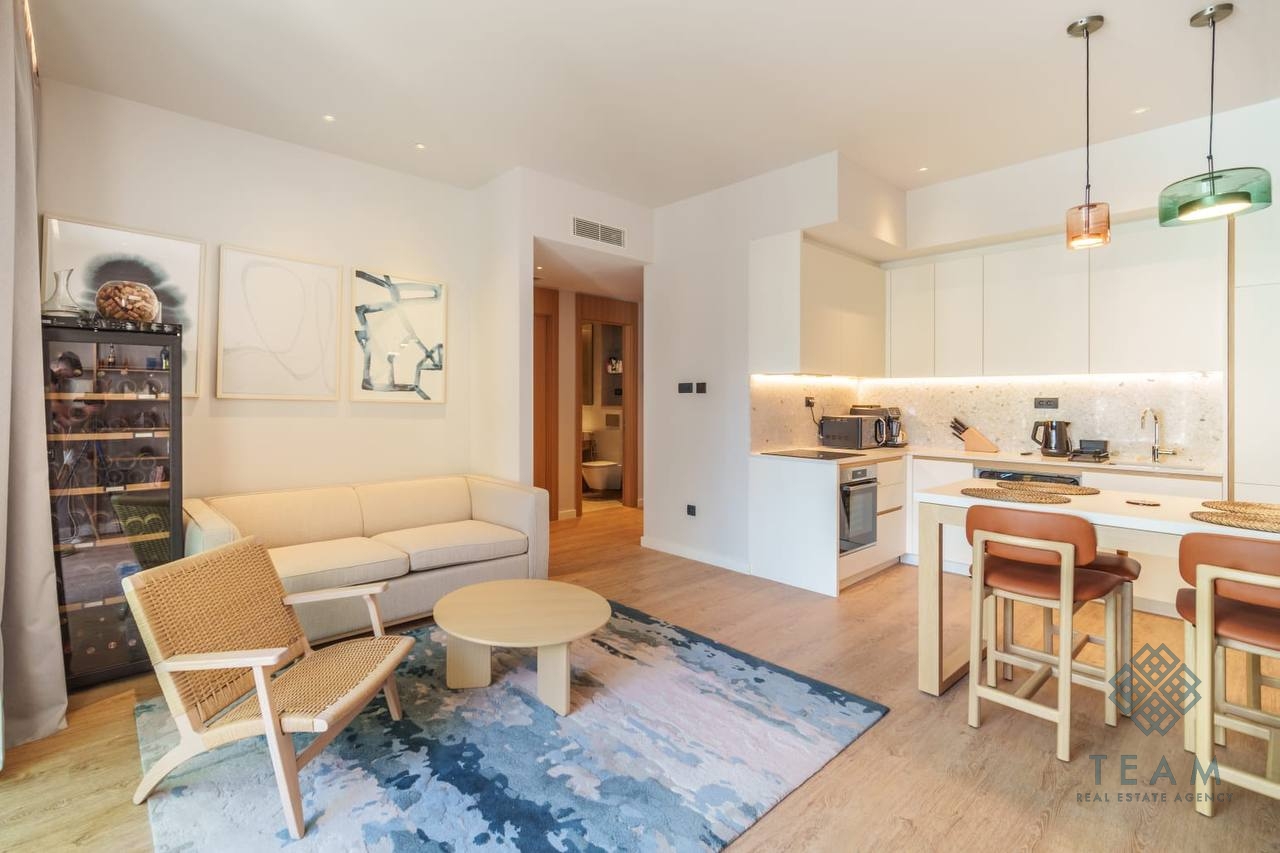 Квартира отличается функциональной планировкой и тщательно продуманным интерьером высокого класса, что делает её идеальным сочетанием элегантности и уюта. В структуру входят гостиная с обеденной зоной и современной кухней, спальня и ванная комната — каждый элемент пространства продуман до мелочей, обеспечивая максимальный комфорт и эстетику.