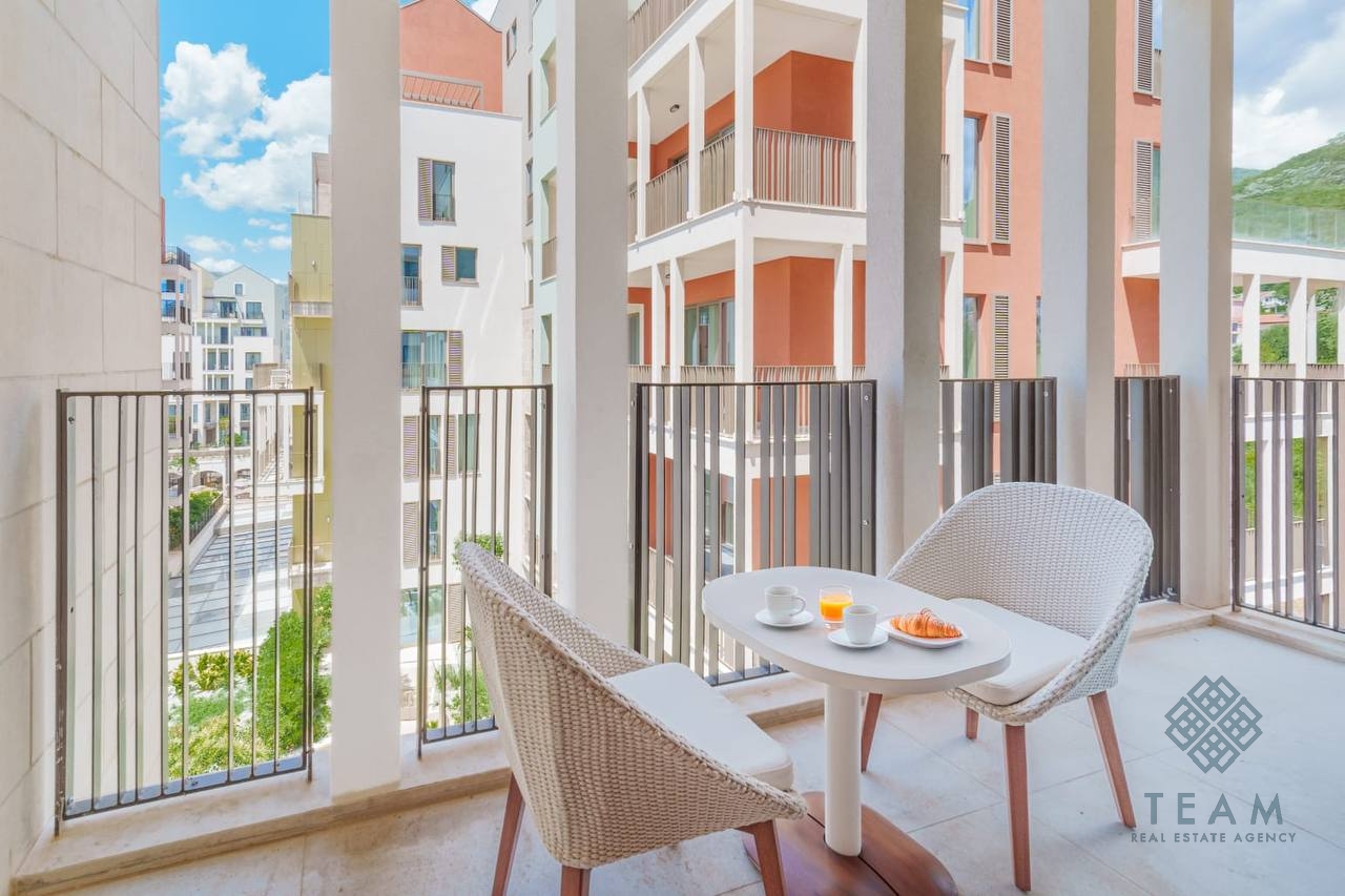 Полностью меблированная однокомнатная квартира площадью 55 м², расположена на четвёртом этаже престижного жилого комплекса Boka Place в Тивате, с прекрасным видом на море.