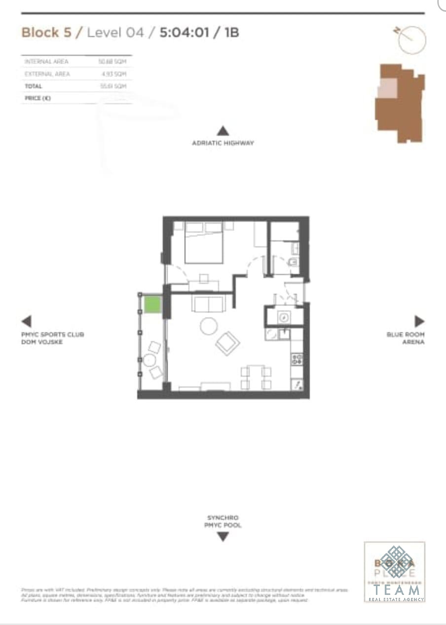 Комплекс Boka Place предлагает современную архитектуру, первоклассный дизайн и развитую инфраструктуру с многочисленными удобствами — ресторанами, бутиками, спа- и фитнес-центрами, а также прогулочными зонами, ведущими к Porto Montenegro, знаменитой роскошной марине. Близость аэропорта Тиват, Котора и Будвы делает это место особенно удобным и востребованным.