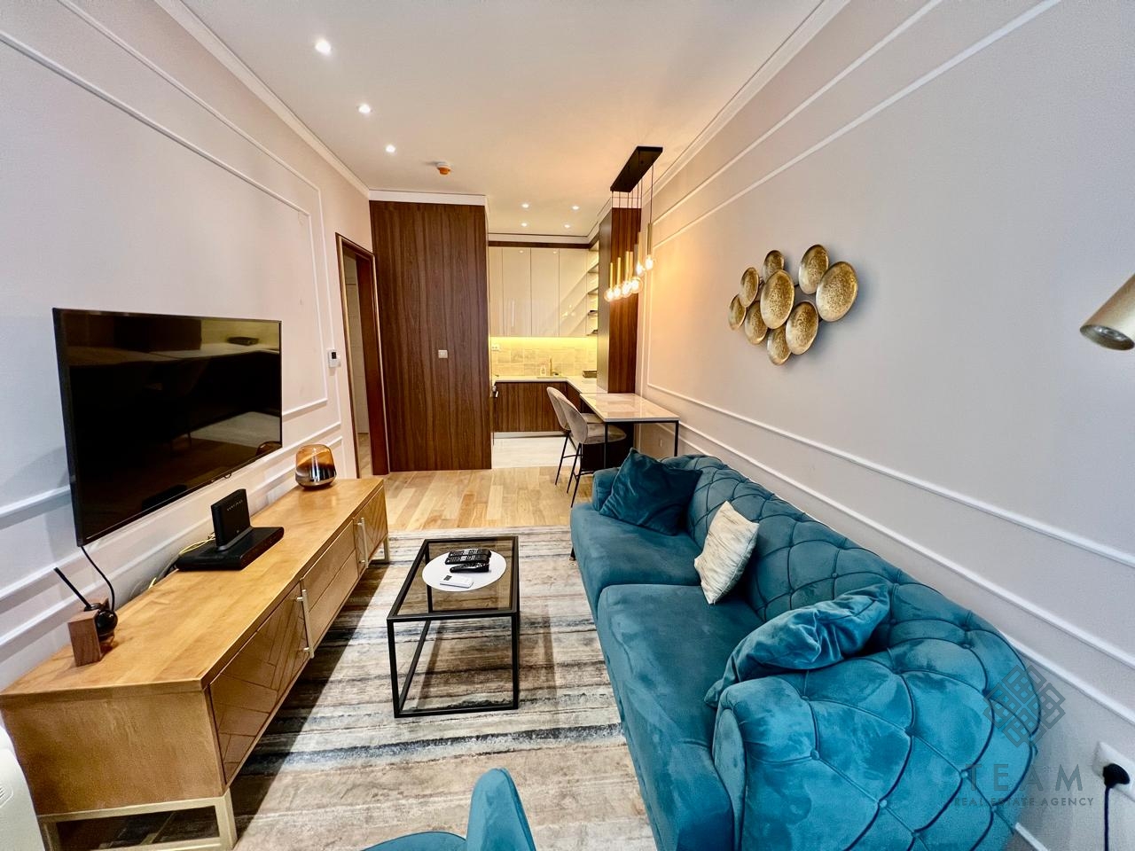 Daire, maksimum konfor ve işlevsellik sağlamak üzere modern şekilde tasarlanmıştır. Geniş bir oturma odası, tam donanımlı mutfak ve yemek alanı, bir yatak odası, banyo ve terastan oluşmaktadır. Dairenin değerini artıran özellikler arasında yerden ısıtma sistemi ve yangın güvenlik sistemi bulunmaktadır.