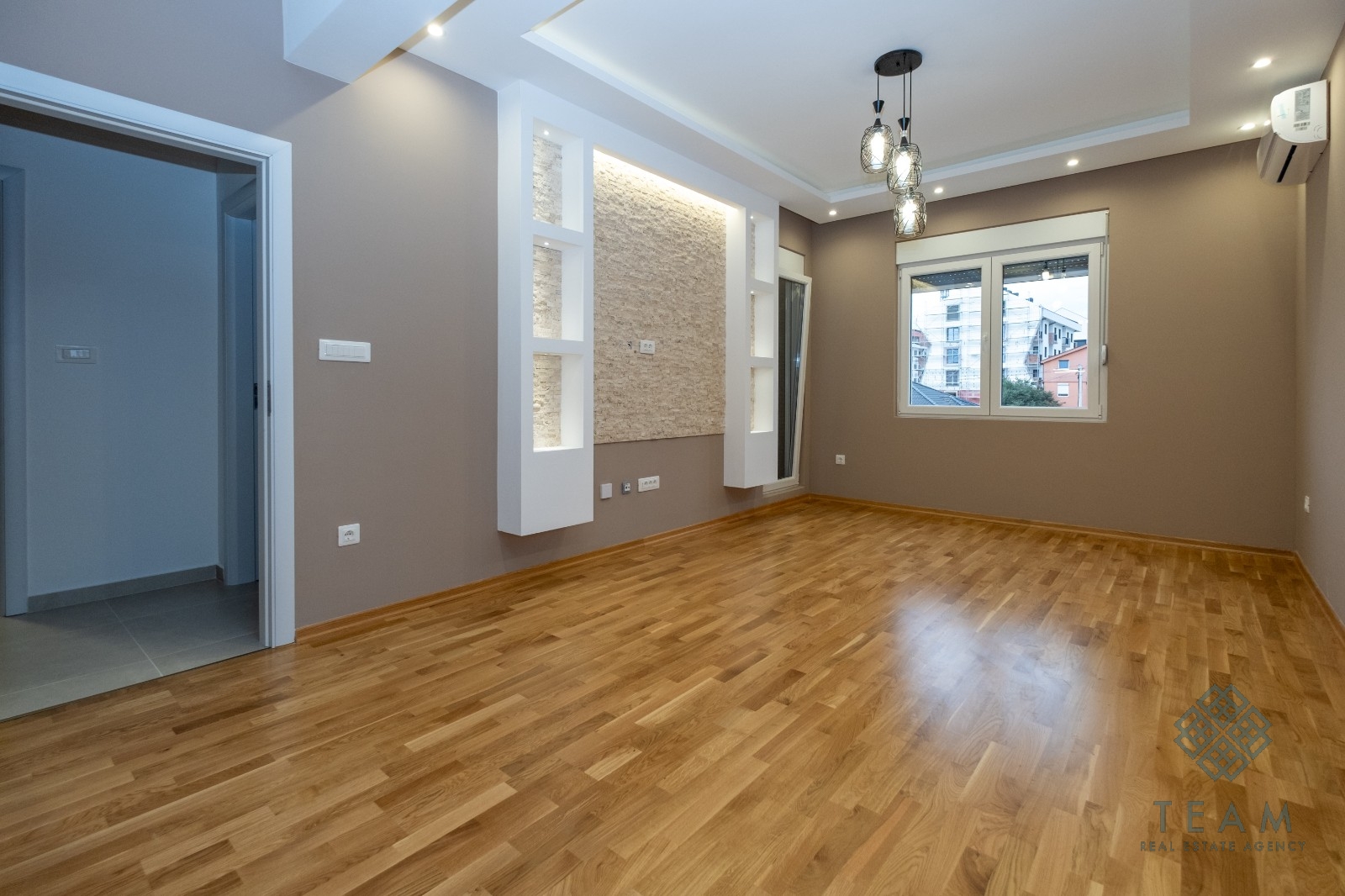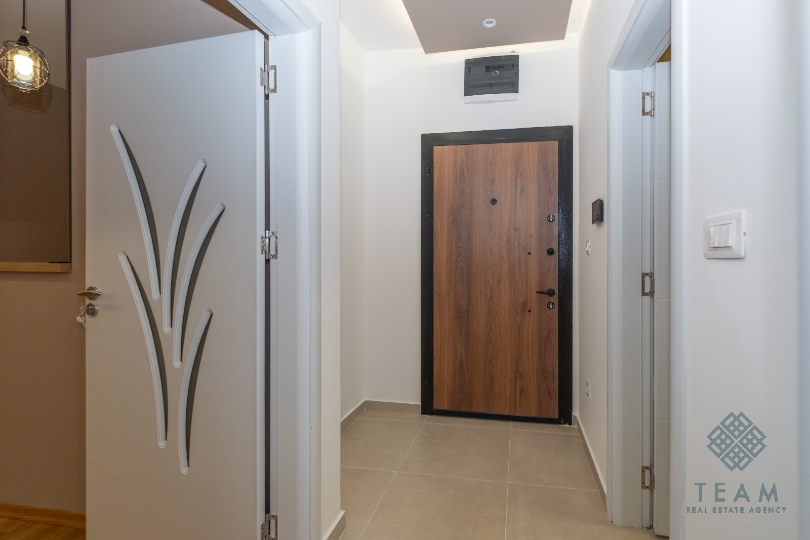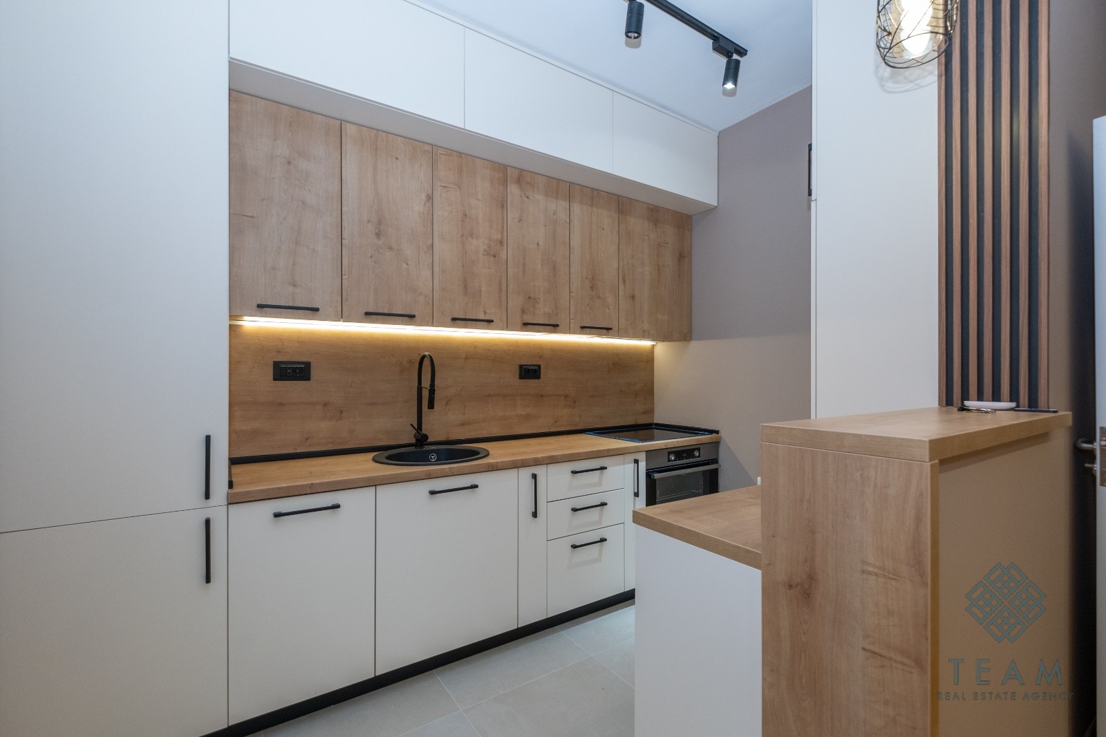 Planında giriş holü, mutfak ve yemek alanıyla birleştirilmiş oturma odası, yatak odası, banyo ve teras bulunmaktadır. Dairede MDF’den yapılmış özel tasarım mutfak, bar tezgâhı, dekoratif taş kaplama ve modern aydınlatma mevcuttur. Fiyata ait olduğu garajda bir otopark yeri dâhildir.